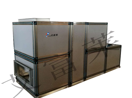 內(nèi)設(shè)均流板,供均勻段面空氣流速用,用于水平出風(fēng)風(fēng)機(jī)段后及過(guò)濾段加熱段消聲段前。